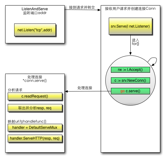 How do we accept client requests after we begin listening to a port? In the source code, we can see that srv.Serve(net.Listener) is called to handle client requests. In the body of the function there is a for{}. It accepts a request, creates a new connection then starts a new goroutine, passing the request data to the go c.serve() goroutine. This is how Go supports high concurrency, and every goroutine is independent.