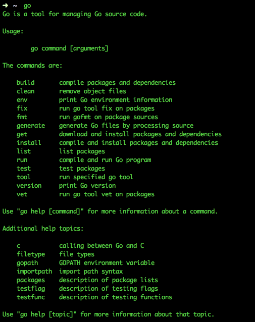 如果出现Go的Usage信息,那么说明Go已经安装成功了;如果出现该命令不存在,那么可以检查一下自己的PATH环境变中是否包含了Go的安装目录。